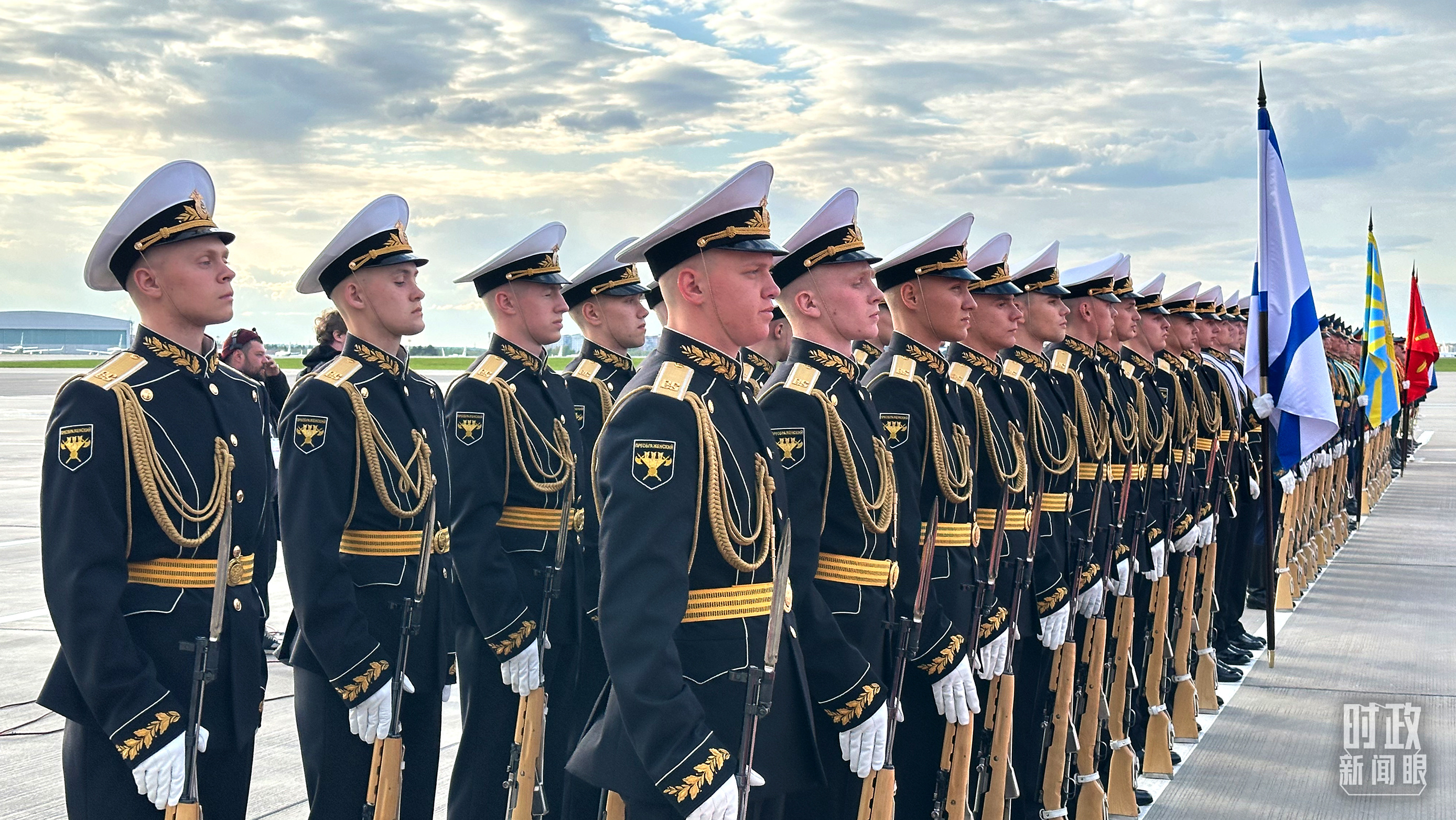 俄方在机场举行隆重迎接仪式。军乐团奏中俄两国国歌。习主席检阅仪仗队并观看分列式。