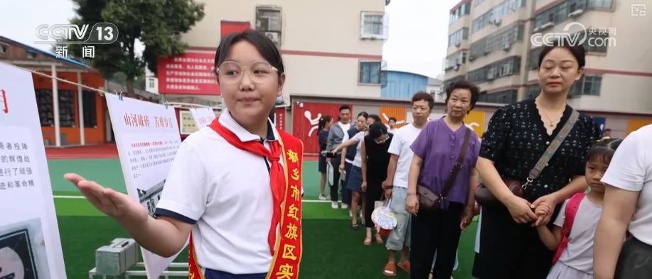 在河南新乡,红旗区实验小学把爱国主义教育与开学典礼相结合,为孩子们带来了难忘的开学第一课。学校举办了抗战主题展览,以“山河破碎”“烽火岁月”“胜利之光”“薪火相传”四个篇章展现抗战历程。还配有专属二维码,家长扫码即可和孩子一起收听革命故事音频、观看英雄人物短视频。“小小讲解员”们则声情并茂地为一年级新生讲述抗战故事。