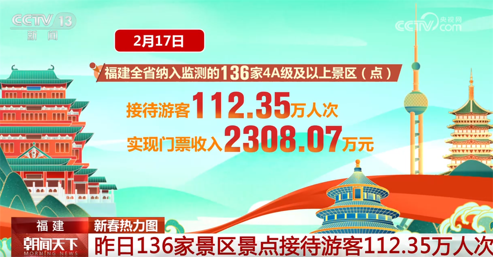 记者从福建文旅厅了解到,17日,福建全省纳入监测的136家4A级及以上景区(点)共接待游客112.35万人次,实现门票收入2308.07万元。