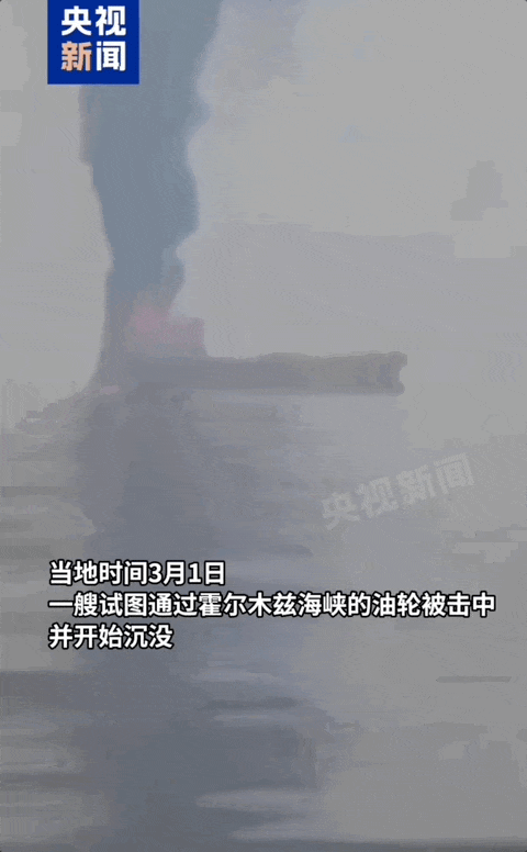 当地时间3月1日,一艘试图通过霍尔木兹海峡的油轮被击中,并开始沉没。