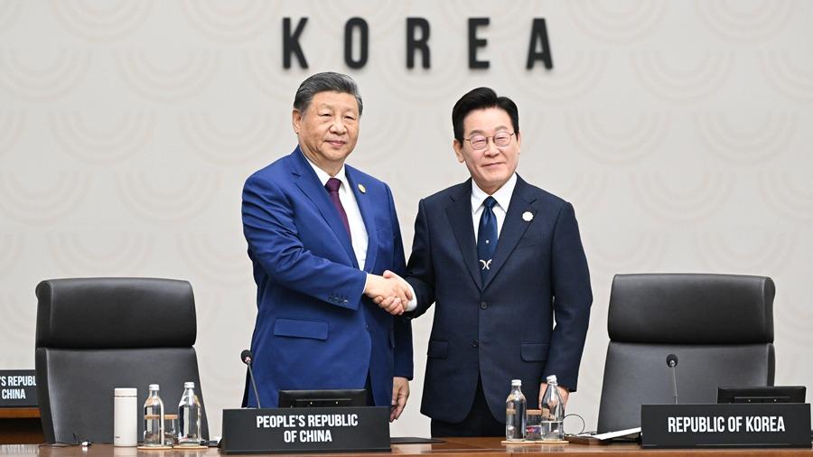 当地时间11月1日下午,韩国总统李在明同中国国家主席习近平在庆州博物馆举行会谈。
